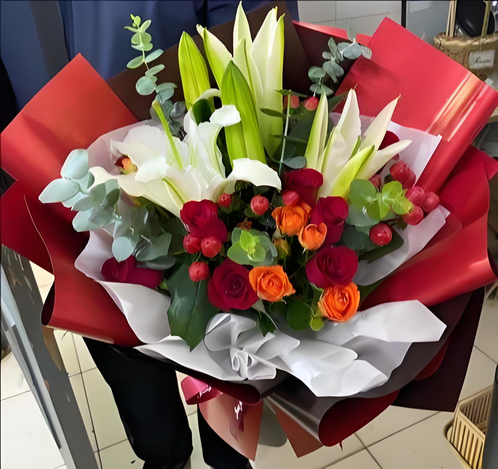 延安宜川县花店包11枝红玫瑰、2枝多头白百合、6枝橙色多头玫瑰、红豆、尤加利叶